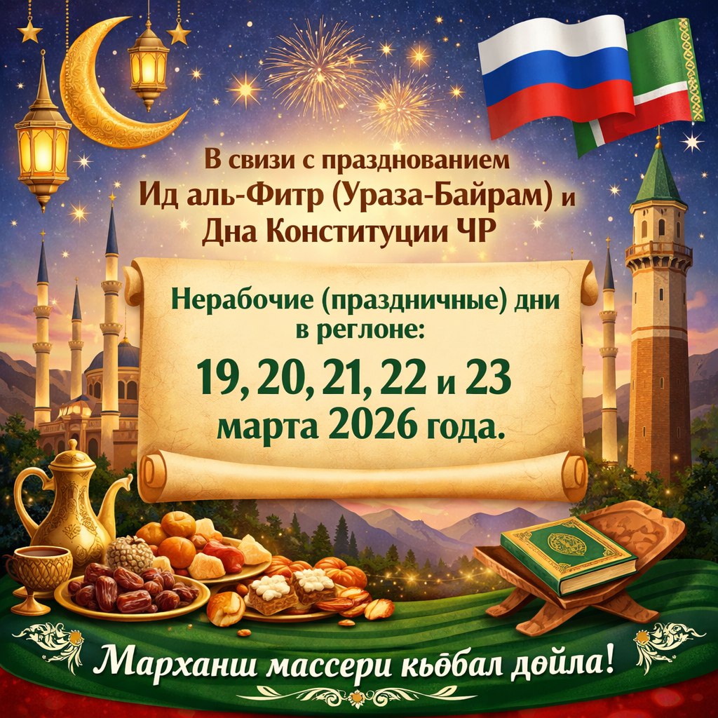 18.03.2026Информируем вас о том, что в связи с празднованием Ид аль-Фитр (Ураза-Байрам) и Дня Конституции ЧР *нерабочими (праздничными) днями* на территории региона устанавливаются *19, 20, 21, 22 и 23 марта 2026 года.*